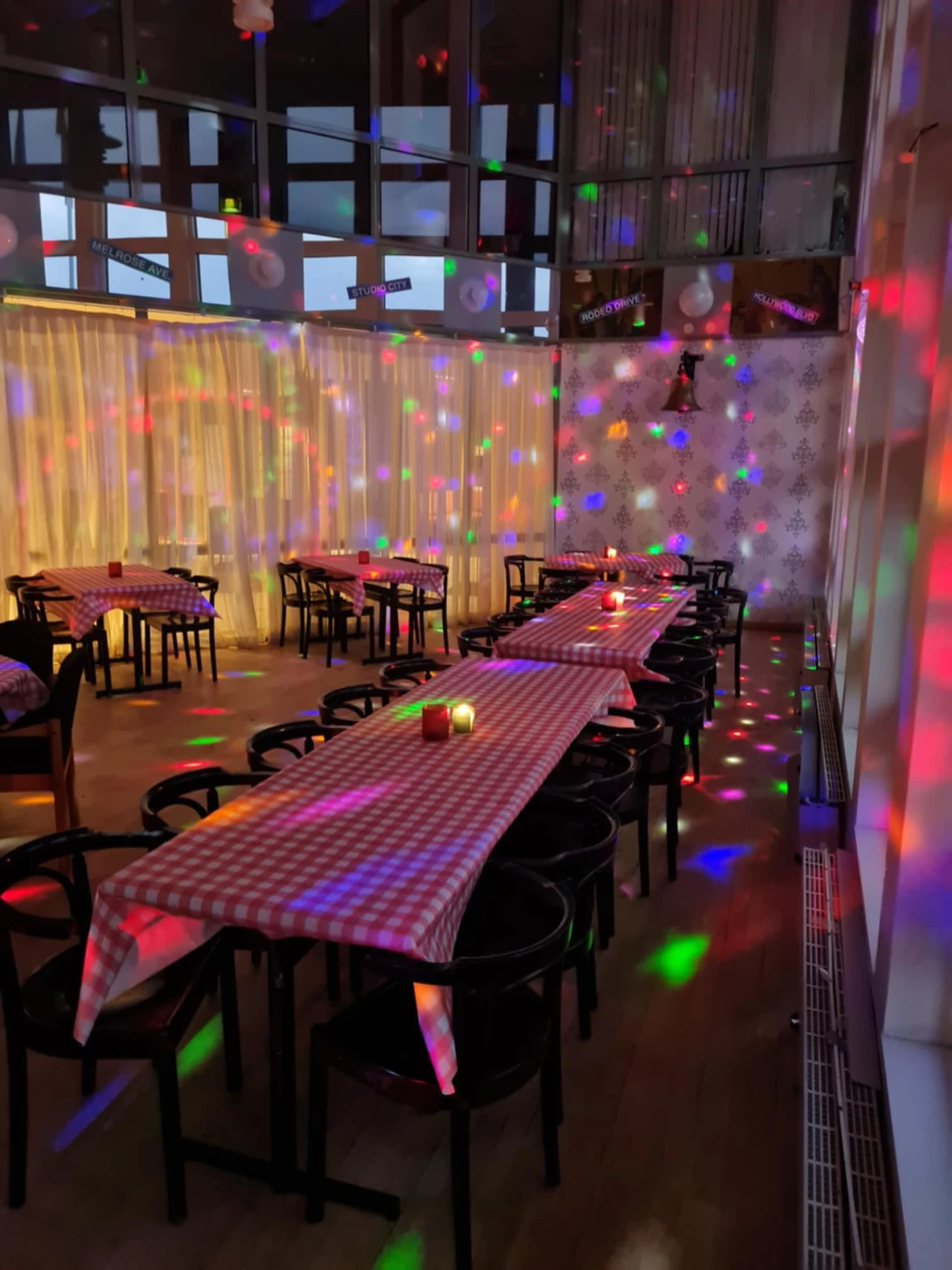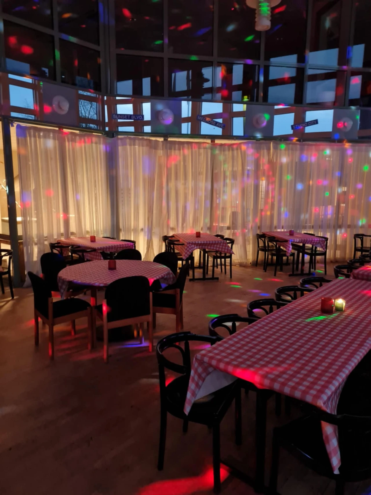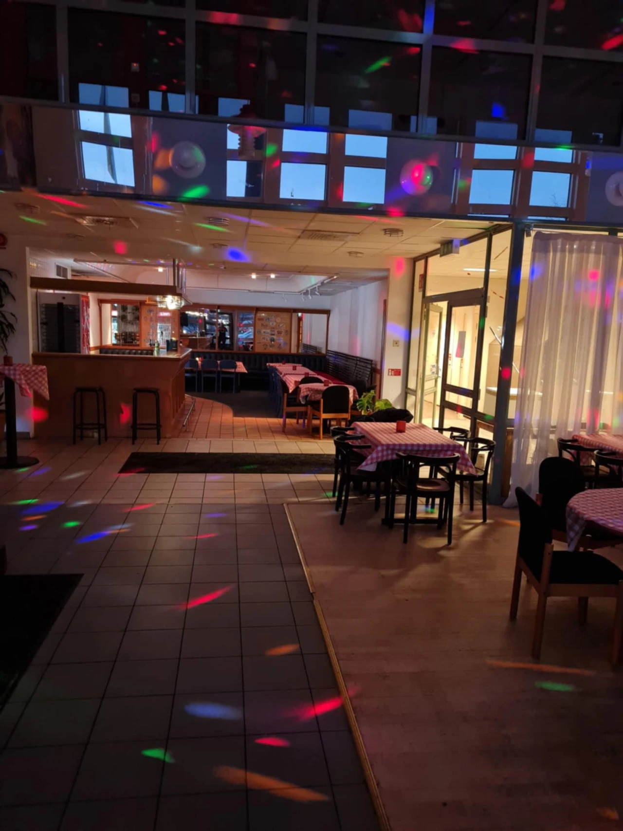 Vår restaurang är mycket rymlig och högt i tak. Det finns 100 sittplatser och en trevlig danshörna. Och det finns ett stort utrymme för barnen att leka eller lugnare samtal i en annan avdelning.